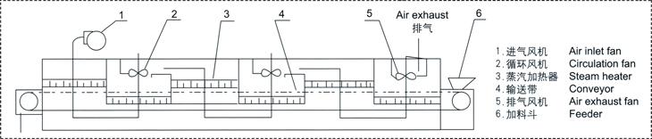 The materials in the hopper of the DW series belt dryer are evenly laid on the mesh belt by the feeder. The mesh belt is made of 12-60 mesh stainless steel wire mesh, which is dragged by the transmission device to move inside the dryer. The drying section consists of several units, each with independent circulation of hot air. Some of the exhaust gas is discharged by a dedicated dehumidification fan, and the amount of air discharged from each unit is controlled by a regulating valve. In the upper circulating unit, the air from the circulating fan enters the lower chamber of the unit through the side air duct, and the airflow is heated up through the heat exchanger and distributed by the distributor. The jet stream blows towards the mesh belt, passes through the material, and enters the upper chamber. The drying process is a process where hot air flows through the material layer, completing the transfer of heat and quality. The upper chamber is connected to the inlet of the fan by an air duct, with most of the gas fluid circulating. A portion of the gas with lower temperature and higher humidity content is discharged as waste gas through the dehumidification pipe, regulating valve, and dehumidification fan. In the lower circulation unit, the air from the circulating fan first enters the upper chamber, is heated downwards by the heat exchanger, passes through the material layer, and enters the lower chamber. The lower chamber is connected to the fan inlet by side air ducts and return air ducts, with most of the gas circulating and some discharged. The upper and lower loop units can be flexibly equipped according to user needs, and the number of units can also be selected according to needs.