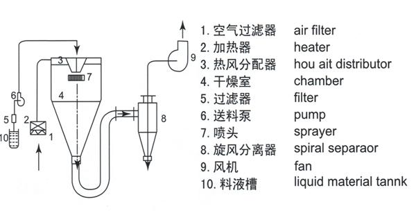 LPG系列高速離心噴霧干燥機(jī)的空氣經(jīng)過(guò)過(guò)濾和加熱,進(jìn)入干燥器頂部空氣分配器熱空氣呈螺旋狀均勻地進(jìn)入干燥室,料液經(jīng)塔體頂部的高速離心霧化器(旋轉(zhuǎn))噴霧成極細(xì)微的霧狀液珠與熱空氣并流接觸,在極短的時(shí)間內(nèi)可干燥為成品。成品連續(xù)地由干燥塔底部和旋風(fēng)分離器中輸出廢氣由風(fēng)機(jī)排空。特點(diǎn):