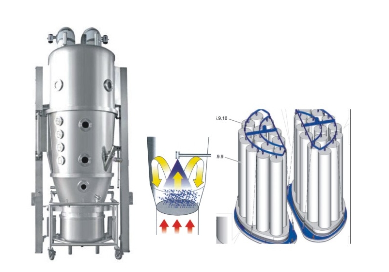 需要制粒的單一或多種粉體原料在沸騰床內(nèi)建立流態(tài)化過程,同時(shí)混合,粘結(jié)劑經(jīng)特制噴槍霧化噴至流化界面,物料凝聚成粒并干燥,揮發(fā)水份由風(fēng)機(jī)排出。集混合、制粒、干燥多功能于一體,自動(dòng)化程度高,能快速制粒,快速干燥。