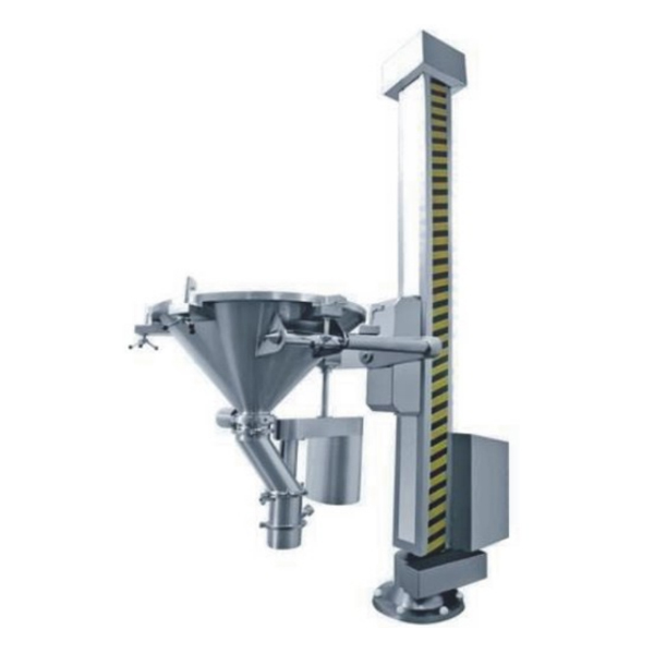 該機(jī)由NTF固定提升轉(zhuǎn)料機(jī)和ZL整粒機(jī)組成。工作時(shí),將錐形料斗與沸騰制粒機(jī)或沸騰干燥機(jī)的料倉(cāng)扣合。啟動(dòng)提升按鈕,料倉(cāng)提升;啟動(dòng)翻轉(zhuǎn)按鈕,料倉(cāng)即可翻轉(zhuǎn)180°。松開(kāi)剎車(chē),水平旋轉(zhuǎn)立柱到工藝要求位置,再下降料倉(cāng)到工作高度,開(kāi)啟整粒機(jī),打開(kāi)蝶閥,使物料經(jīng)過(guò)整粒后密閉轉(zhuǎn)移到下一工序。